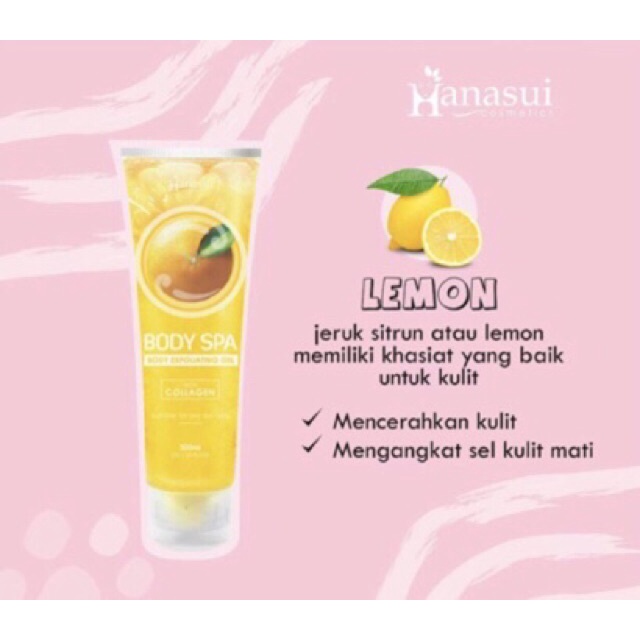 BODY SPA HANASUI mengandung COLLAGEN dan berbagai ekstra tumbuhan alami,yang dapat mengangkat debu dan kotoran di kulit kita, dalam waktu singkat dapat: ♡ Melembabkan kulit ♡ Meningkatkan aktivitas sel ♡ Memperlambatkan penuaan kulit ♡ Mengangkat sel kulit mati ♡ Memutihkan kulit ♡ Menghaluskan kulit ♡ Membuat kulit kenyal dan berseri-seru