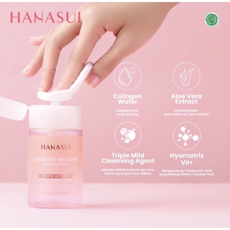 1. Hanasui Collagen Micellar Cleansing Water adalah pembersih wajah yang lembut dan tidak perlu dibilas. Mengandung Collagen Water (Collagen Ferment Filtrate), Hyamatrix 7+ dengan kombinasi 7 Hyaluron active di dalamnya dan ekstrak lidah buaya untuk menghapus riasan, minyak berlebih, serta kotoran tanpa menghilangkan kelembapan alami kulit.