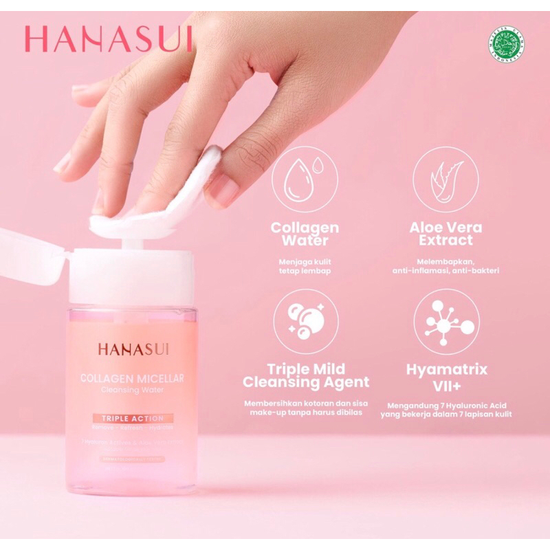 Hanasui Collagen Micellar Cleansing Water adalah pembersih wajah yang lembut dan tidak perlu dibilas. Mengandung Collagen Water (Collagen Ferment Filtrate), Hyamatrix 7+ dengan kombinasi 7 Hyaluron active di dalamnya dan ekstrak lidah buaya untuk menghapus riasan, minyak berlebih, serta kotoran tanpa menghilangkan kelembapan alami kulit.