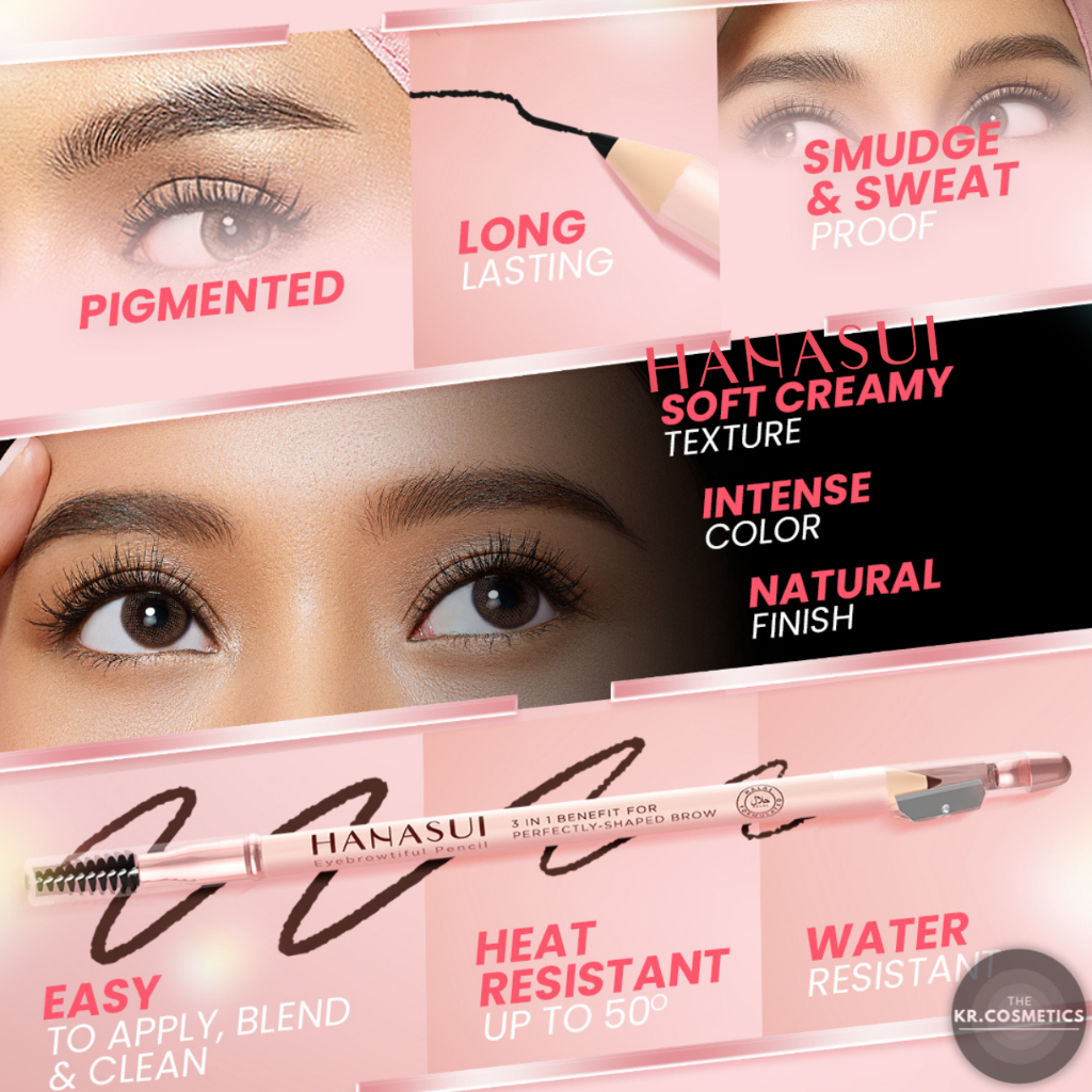 Hanasui Eyebrowtiful Pencil adalah Pensil alis dengan formula tahan lama yang lembut membentuk dan mengisi alis mata dengan sapuan yang cepat dan mudah. Dilengkapi rautan pada penutupnya dan sikat spoolie pada sisi penutup lainnya menciptakan hasil akhir yang rapi dan alami.