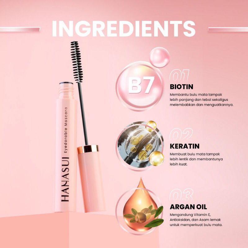 Hanasui Eyedorable Mascara yang memberikan volume, memanjangkan, dan mengangkat bulu mata agar terlihat lebih penuh. Mengandung Biotin, Keratin, dan Argan Oil untuk membuat bulu mata terlihat lebih panjang, tebal, lentik, juga menambah kilau dan memperkuat bulu mata. Waterproof, smudgeproof, dan tahan lama sepanjang hari.