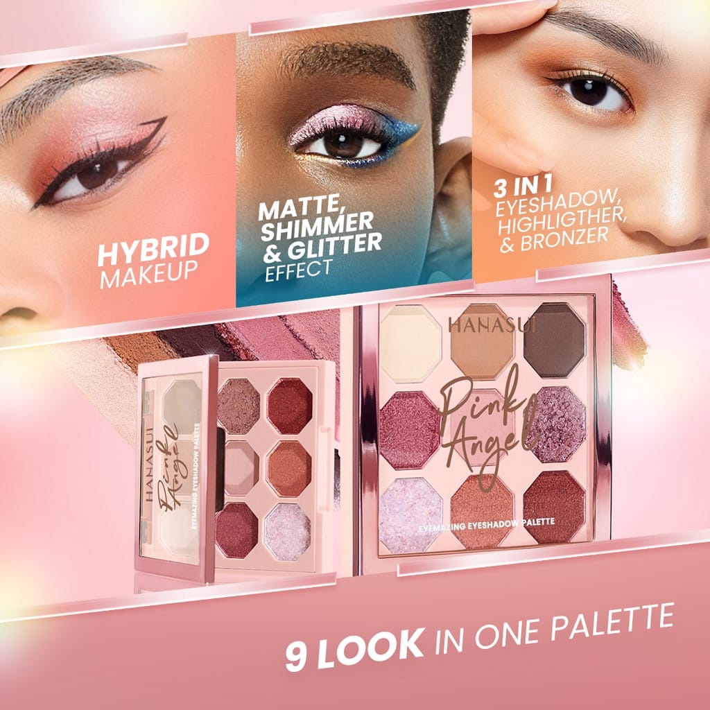Hanasui Eyemazing Eyeshadow Palette dengan 3 varian yang mempunyai kombinasi 9 warna intens dan sangat pigmented, mulai dari warna-warna nude dan coklat yang netral, pink yang merona, hingga warna-warna yang gelap ala smokey look. Terdiri dari warna dengan hasil akhir matte, shimmer, dan glitter yang cocok untuk tampilan natural, modern, dan glamour. Selain itu terdapat varian warna yang bisa digunakan sebagai highlighter dan bronzer untuk menambahkan dimensi ke seluruh wajah.