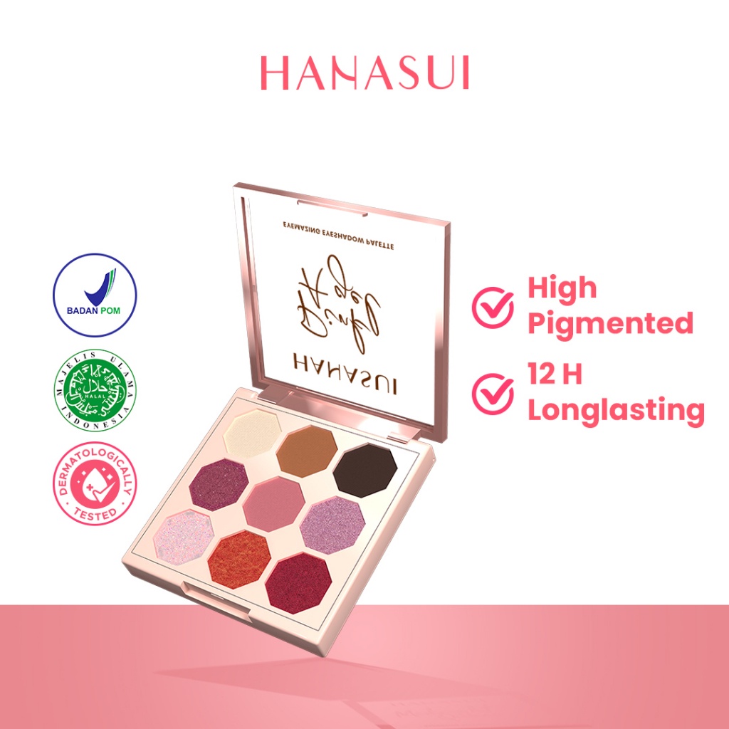 Hanasui Eyemazing Eyeshadow Palette dengan 3 varian yang mempunyai kombinasi 9 warna intens dan sangat pigmented, mulai dari warna-warna nude dan coklat yang netral, pink yang merona, hingga warna-warna yang gelap ala smokey look. Terdiri dari warna dengan hasil akhir matte, shimmer, dan glitter yang cocok untuk tampilan natural, modern, dan glamour. Selain itu terdapat varian warna yang bisa digunakan sebagai highlighter dan bronzer untuk menambahkan dimensi ke seluruh wajah.
