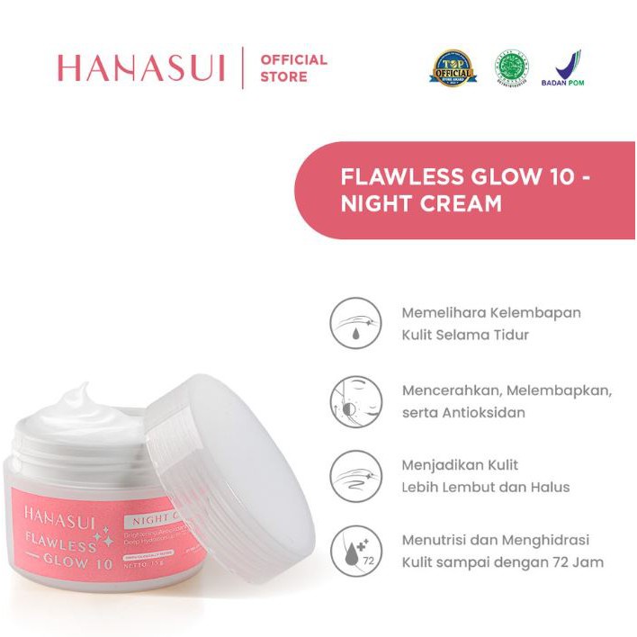 Hanasui Flawless Glow 10 Hadir untuk menjadi solusi para wanita yang ingin melakukan perawatan wajah namun dengan biaya yang tidak banyak. Memiliki 4 rangkaian yakni Facial Wash 60 ml, Essence 100 ml, Day Cream 15 gr dan Night Cream 15 gr. Dengan 1 rangkaian tersebut, konsumen dapat merasakan 10 manfaat sekaligus.