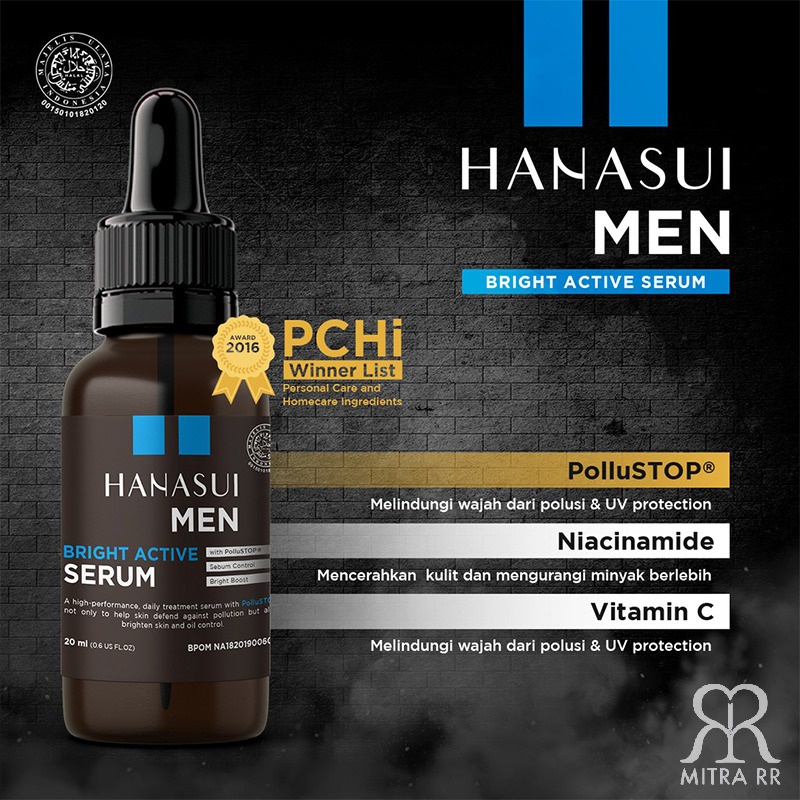 Hanasui Men Bright Active Serum membantu memberikan solusi khususnya kepada pria, serum harian untuk para lelaki aktif yang sering melakukan aktivitas diluar ruangan, dengan kandungan pollustop®, Niacinamide, Vitamin C, dan Glycerin yang tidak hanya membantu kulit menghadapi polusi tetapi juga dapat mencerahkan wajah serta mengontrol minyak berlebih.