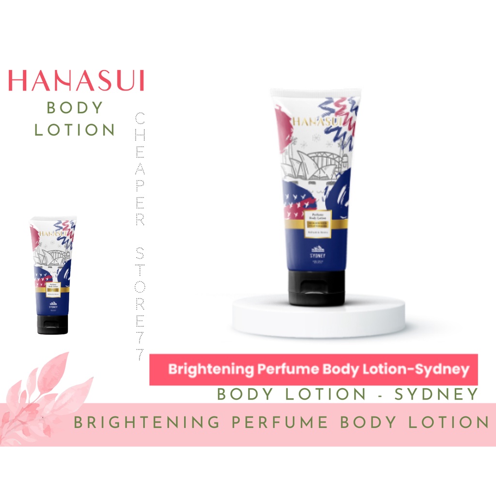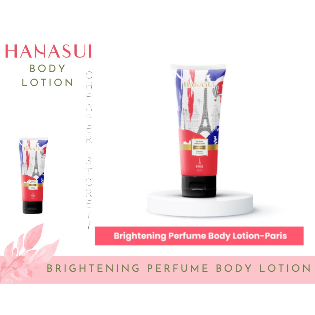 HANASUI Perfume Body Lotion UVA UVB Protection Kini hadir Hanasui Brightening Perfume Body Lotion yang terinspirasi oleh romantisme Paris,Tokyo yang elegant dan kemegahan Sydney tercermin dalam keharumannya yang ekslusif,diharapkan mampu memenuhi kebutuhan perempuan aktif dan dinamis dalam merawat kesehatan kulit dan ingin selalu tampil percaya diri.