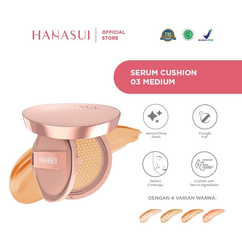 Hanasui Serum Cushion adalah cushion yang mengandung kombinasi Niacinamide, Sodium Hyaluronate, Vitamin E , dan Ekstrak Aloe Vera yang memberikan manfaat perawatan kulitdan coverage wajah.
