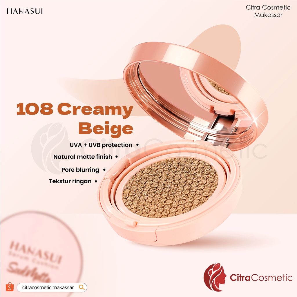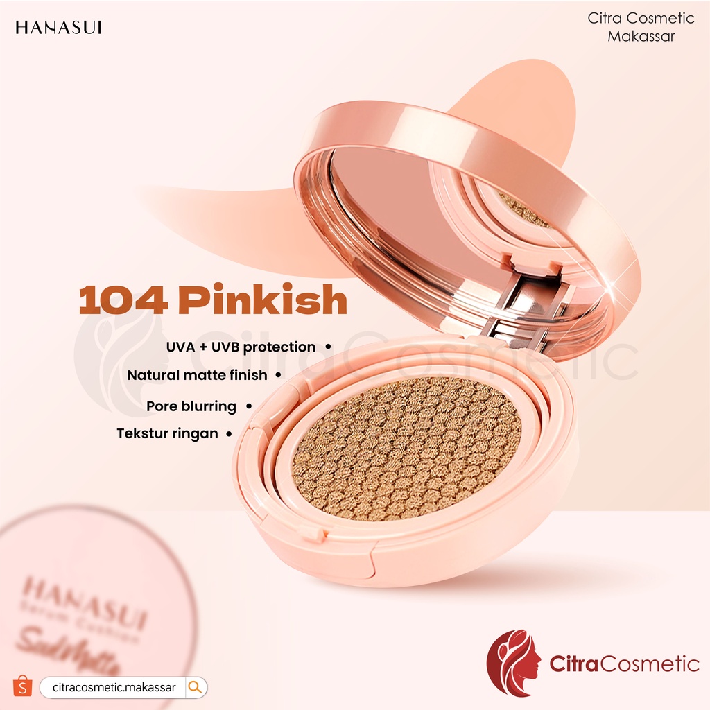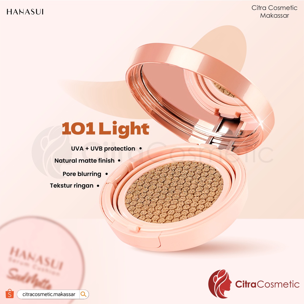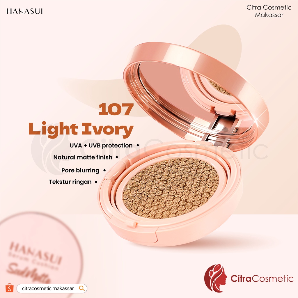 Hanasui Serum Cushion SoulMatte Serum cushion dengan hasil akhir matte mengandung kombinasi Niacinamide, Sodium Hyaluronate, dan Peptide memberikan coverage sekaligus manfaat perawatan kulit. Dengan tekstur ringan yang menyatu di kulit menciptakan tampilansempurna yang bertahan sepanjang hari.