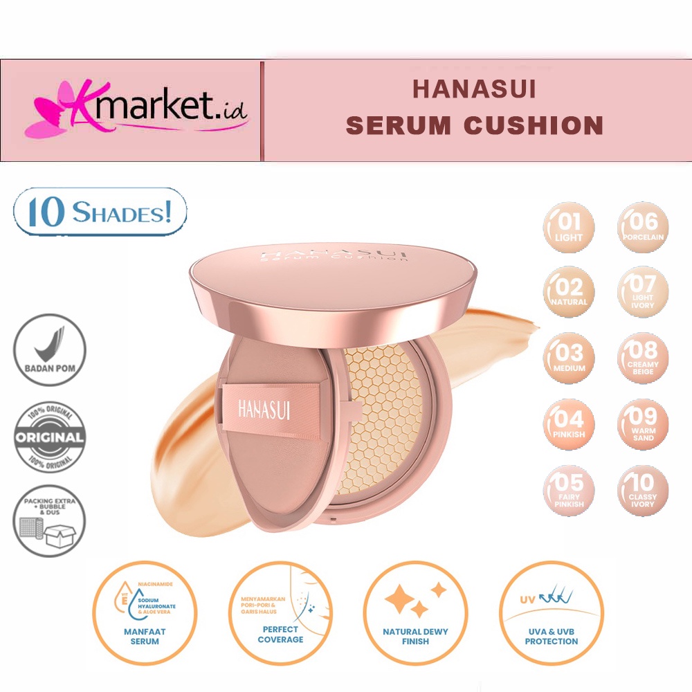 HANASUI Serum Cushion Hanasui Serum Cushion adalah cushion yang mengandung kombinasi Niacinamide, Sodium Hyaluronate, Vitamin E , dan Ekstrak Aloe Vera yang memberikan manfaat perawatan kulitdan coverage wajah.
