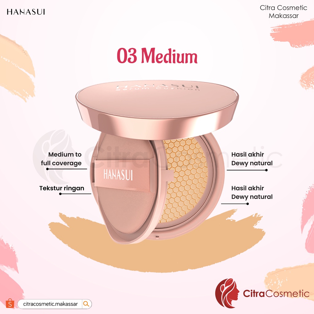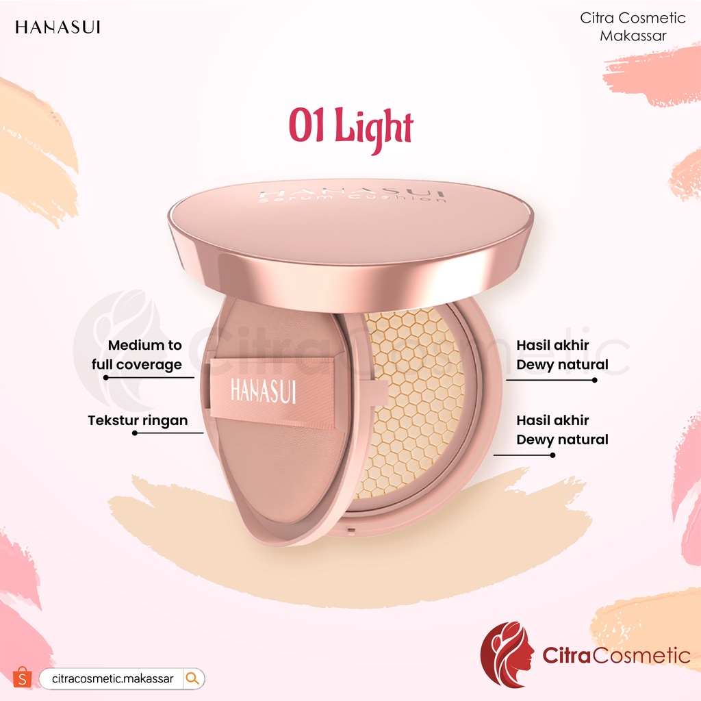 Hanasui Serum Cushion adalah cushion yang mengandung kombinasi Niacinamide, Sodium Hyaluronate, Vitamin E , dan Ekstrak Aloe Vera yang memberikan manfaat perawatan kulitdan coverage wajah. Dengan tekstur ringan dan menutupsempurna, namun tetap melembabkan menjadikan hasil makeup lebih flawless dengan hasil akhir Dewy yang natural. 1. Varian shades dan panduan warna kulit 01 Light 01 Light : Cool Undertone 02 Natural : Neutral Undertone 03 Medium : Warm Undertone 04 Pinkish : Cool Undertone Keunggulan : Multi benefit : cushion dengan manfaat serum Perfect coverage namun tetap melembapkan Flawless dan natural dewy finish Menyamarkan tampilan pori-pori, garis halus, dan noda di wajah UVA & UVB protection Mengandung oil absorber powder dan memberikan blurring effect Memiliki puff dengan ujung segitiga yang mempermudah pengaplikasian sudut wajah