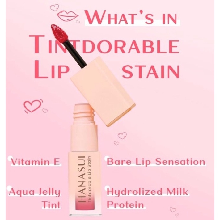 Hanasui Tintdorable Lip Stain adalah lip tint dengan tekstur aqua jelly yang ringan dan memberikan warna cerah natural yang tampak alami dan berkilau. Dengan tekstur yang nyaman dan ringan, membuat bibir tetap lembap dan warna yang tahan lama. Mengandung vitamin E sebagai antioksidan dan hydrolized milk protein untuk meningkatkan hidrasi dan kelembaban kulit.