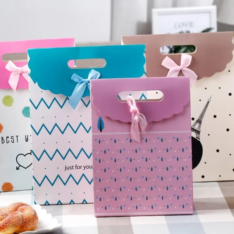 Paper bag yang dilengkapi dengan *Pita manis *Tempat Pegangan *Bahan karton tebal, tidak mudah robek *Design kreatif dan cantik sesuai dengan kebutuhan *Motif tidak pasaran dan terlihat mewah