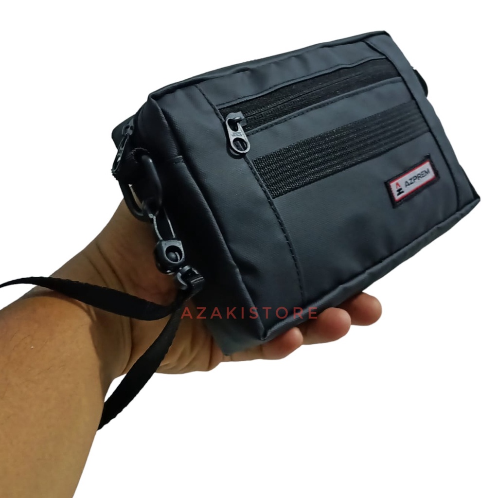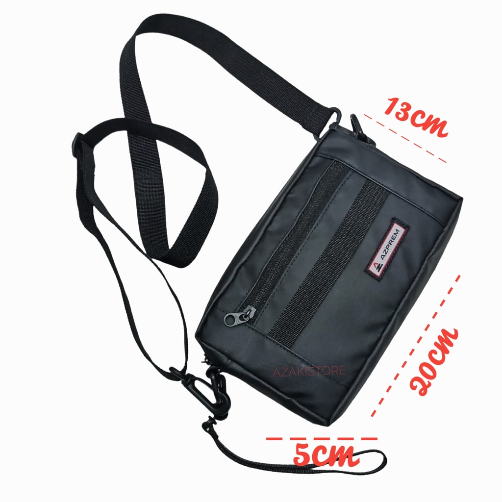 HandBag Slempang Clucth Material : Bimo Waterproof ( tahan air ) Warna : Hitam Dimensi : Panjang 20cm x Tinggi 13cm x Lebar 5cm Kompartemen : 2 Resleting + 3slot kartu + 1slot Tambahan + 1slot Hp Tali : Memiliki 2 Tali, 1 Tali Panajng dan 1 Tali Pendek