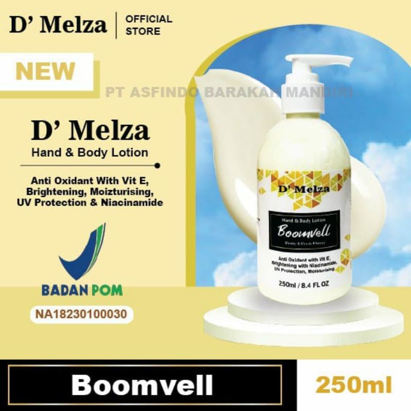 D'MELZA Body Lotion 250 ml (BPOM) ini dikemas ciamik dengan botol plastik pump bening berukuran 250 ml sehingga mudah dibawa kemana-mana bahkan untuk bepergian sekalipun.