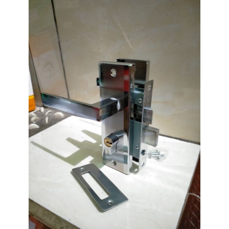 handle kunci kamar komplit satu set siap pasang model minimalis bahan tebal dan kuat. panjang plat gagang 15cm, panjang plat bodi luar 12cm, panjang bodi dalam coakan 9cm, kedalaman coakan bodi 6cm.