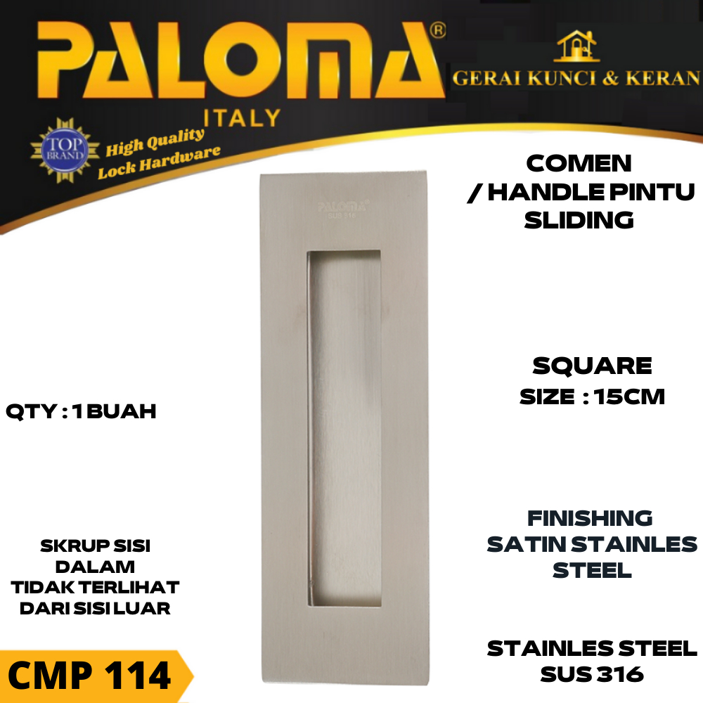 Handle Pintu Sliding PALOMA. - Warna : Satin Stainless Steel. - Material : Stainless Steel Kualitas Super Grade SUS 316. - Kandungan Nickel 11%, Tingkat Ketahan Korosi Terbaik. - Kandungan Chromium 16.5%, Tingkat Ketahan Karat Terbaik. - Kandungan Molybdenum 2.5%, Anti Karat dan Korosi. - Finishing Technology : Pemolesan Dengan Mesin. - Ultra Heavy Duty. Harga Tertera Adalah Harga per Buah.