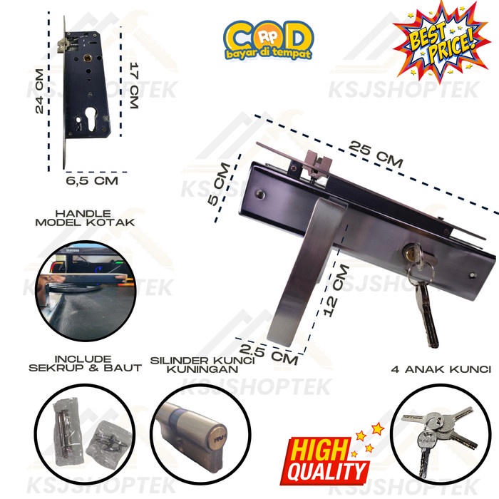 Deskripsi : - Handle Pintu 1 Set - Merk : Hongshu - Type : LAND ROVER - Japan Quality - Ukuran 25 cm x 5 cm - Panjang Handle / pegangan 13 cm - Warna Stainless & Chrome anti karat - Tebal Handle 2,2 cm - Model elegan - Kelengkapan : * 1 Pasang Handle ( 2 buah ) * 1 Set Kunci Body ( Silinder, Kunci Cadangan, Lis Body, Batang Handle ) - Cocok Untuk Pintu 1 Rumah / Kantor alumunium atau kayu