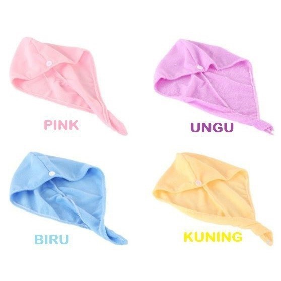 Handuk Rambut berbahan microfiber halus, yg dengan begitu cepat bisa mengeringkan rambut yg basah. Bahan yg dapat menyerap air hanya dalam waktu 5-10 detik saja. Dilengkapi dengan kancing dan pengait supaya tidak mudah lepas ketika digunakan. Sangat mudah digunakan dan dapat dibawa kemana saja dan tidak merusak rambut. "Magic Towel terbuat dari microfibre (serat )dengan tingkat penyerapan air lebih tinggi dari serat yang normal. Menggunakan Magic Towel Cap, Anda dapat mengeringkan rambut Anda dengan cepat & mudah, menghindari kerusakan rambut yang disebabkan oleh pengering rambut dan juga mencegah kerontokan rambut.