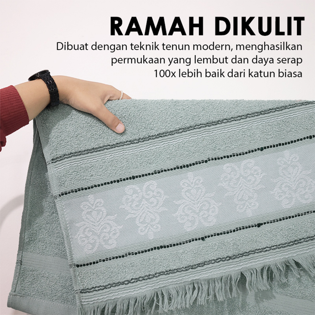 ✅FITUR : ▪ Berdaya serap tinggi bahan halus & lembut dikulit ▪ Dilengkapi teknologi pile towel anti microbial protection (anti bau) ▪ Model desain cantik yang elegan membuatnya lebih mewah ▪ Kualitas tinggi dibuat dengan teknik tenun modern, menghasilkan permukaan yang lembut & daya serap 100x lebih baik dari katun biasa