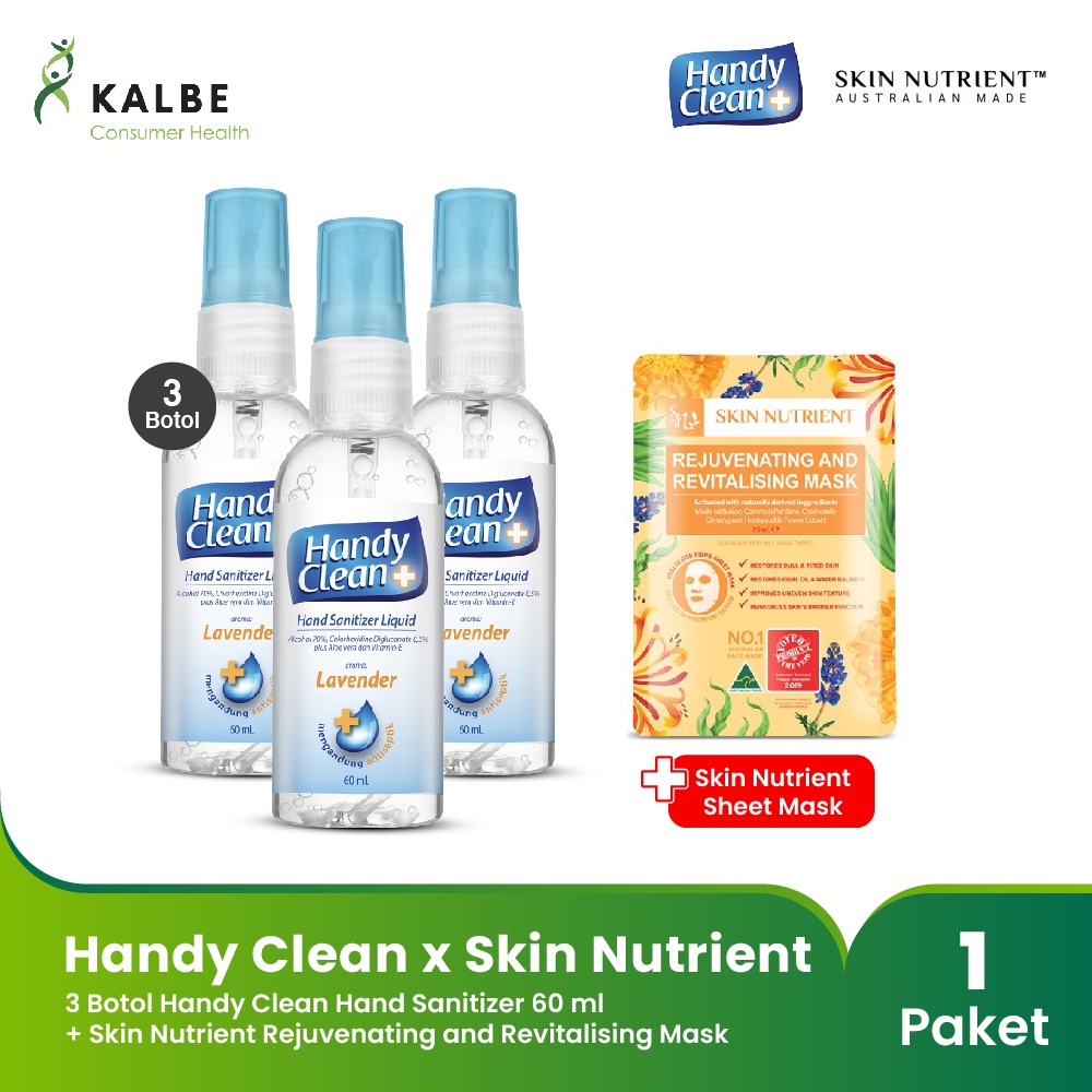Isi Paket : 3 x Handy Clean Hand Sanitizer 60 ml (Expired Date Dec 2023) FREE Skin Nutrient Sheet Mask (Selama persediaan masih ada)