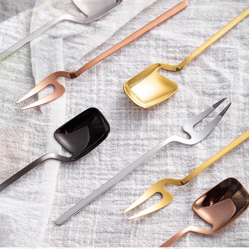 sendok garpu teh model unik gantung V shaped design sendok garpu dapat di letakan menggantung pada bibir gelas atau cangkir multi purpose dapat digunakan untuk dessert, kopi, teh dan keperluan lain nya tersedia 4varian warna: silver, black, gold, rosegold panjang sendok: 14cm panjang garpu: 14,4cm material stainless steel premium grade 304