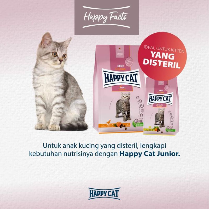 Happy Cat Young Junior Farm Poultry Makanan kering anak kucing yang kaya vitamin untuk daya tahan tubuh serta bahan natural yang mudah dicerna. Formulasi sempurna untuk optimalisasi pertumbuhan si kecil, ideal untuk anak kucing yang belum maupun yang sudah disteril.