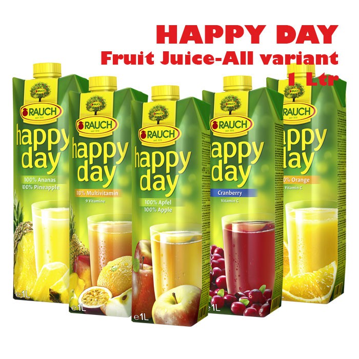 Rauch Happy Day Juice Diproduksi Rauch ini dibuat dari 100% buah tanpa campuran gula. Rauch Happy Day 100% buah cocok untuk Anda pencinta jus dengan rasa manis alami dari buah. Karena 100% murni, kadar gulanya menjadi lebih rendah dibandingkan jus merek lain yang menambahkan gula sebagai pemanis dan mengandung Vitamin C yang sangat tinggi dan bagus untuk kesehatan kita.