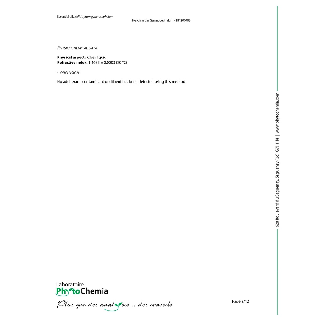 Nama ilmiah: Helichrysum Gymocephalum asal minyak: bunga Ekstraksi: Steam distilasi Aroma : Earthy, bunga dan manis Intensitas Wangi : Medium Evaporaasi : Middle Note Negara Asal: Madagascar