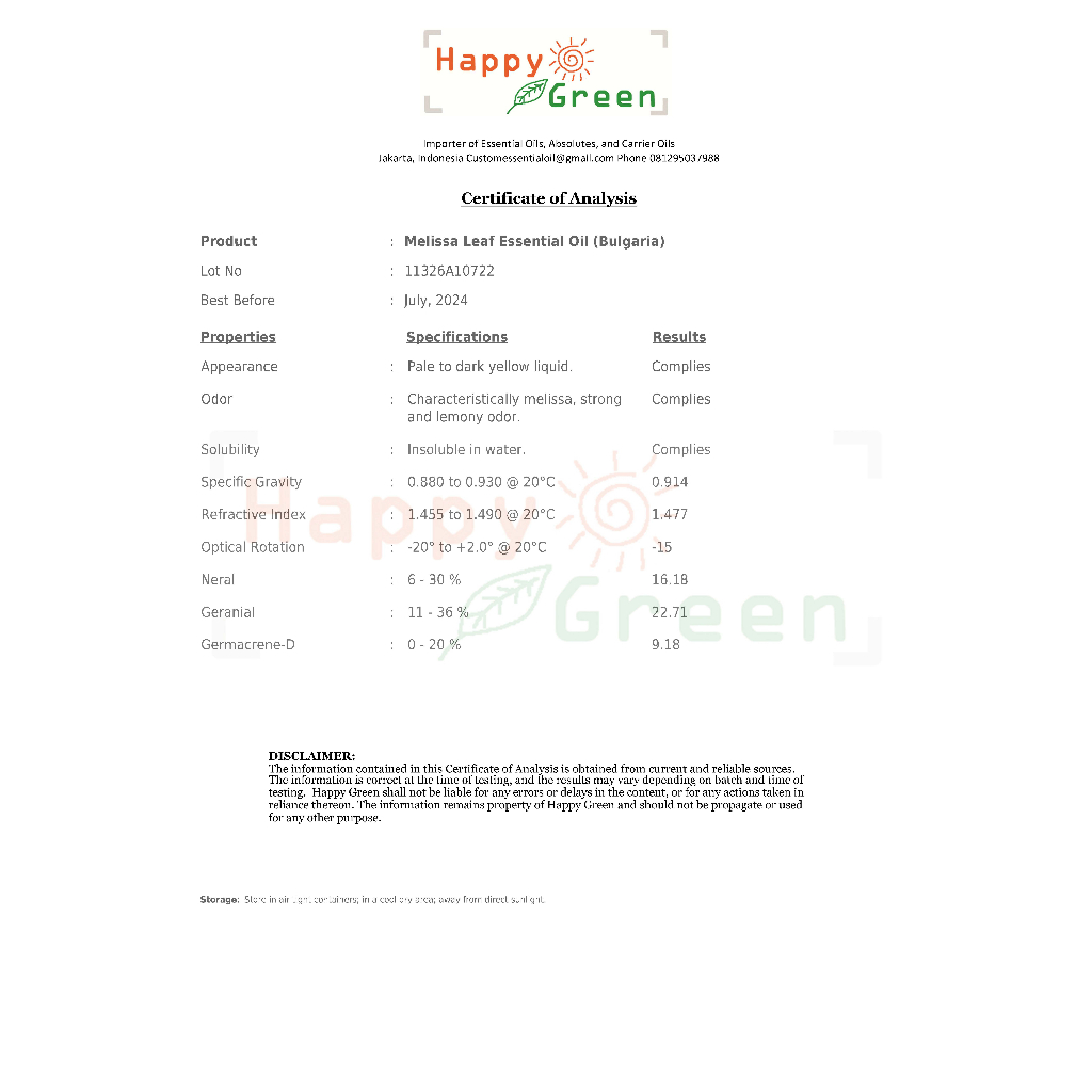 Nama botani: Melissa officinalis. Konstituen Utama: Neral: 19,6% Geranial: 30,7% Bagian Tanaman: Daun Asal: Slovenia Metode Pengolahan: Steam Distilled Diluted 3% concentration di dalam jojoba oil.