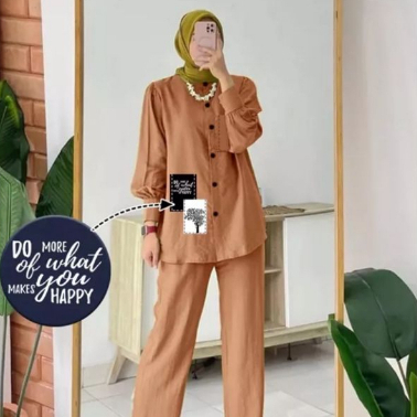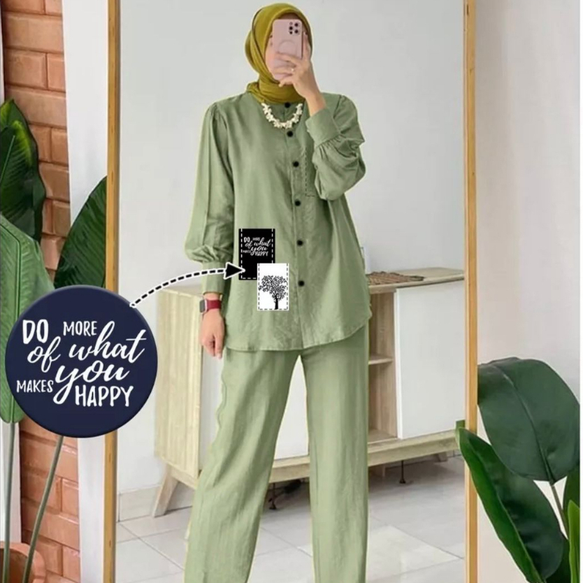Happy set Bahan: Crinkle Airflow Panjang baju: 70cm Panjang Celana: 90cm Lebar Paha: 75cm Berat Badan: 40kg-75kg (Tergantung Bentuk Tubuh)