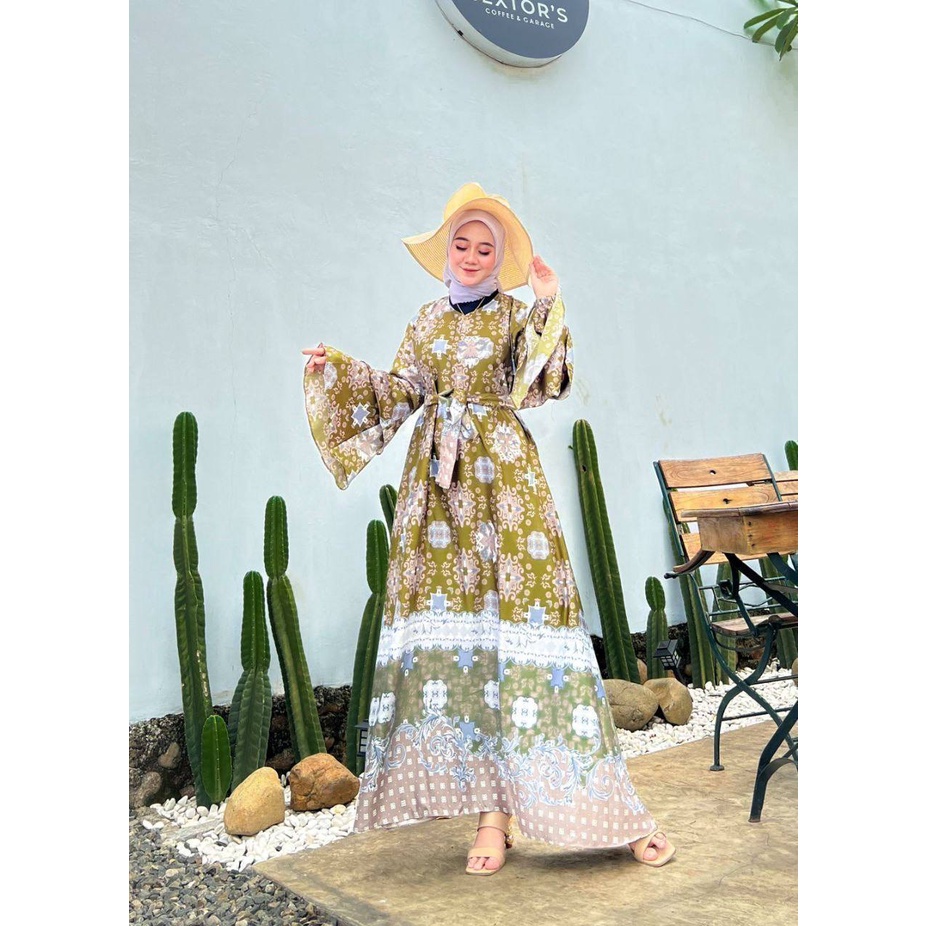 Detail Harera Gamis Terbaru Diora Silk Dress Wanita Lengan Terompet Tumpuk Panjang Maxidress Kekinian LD 110 cm