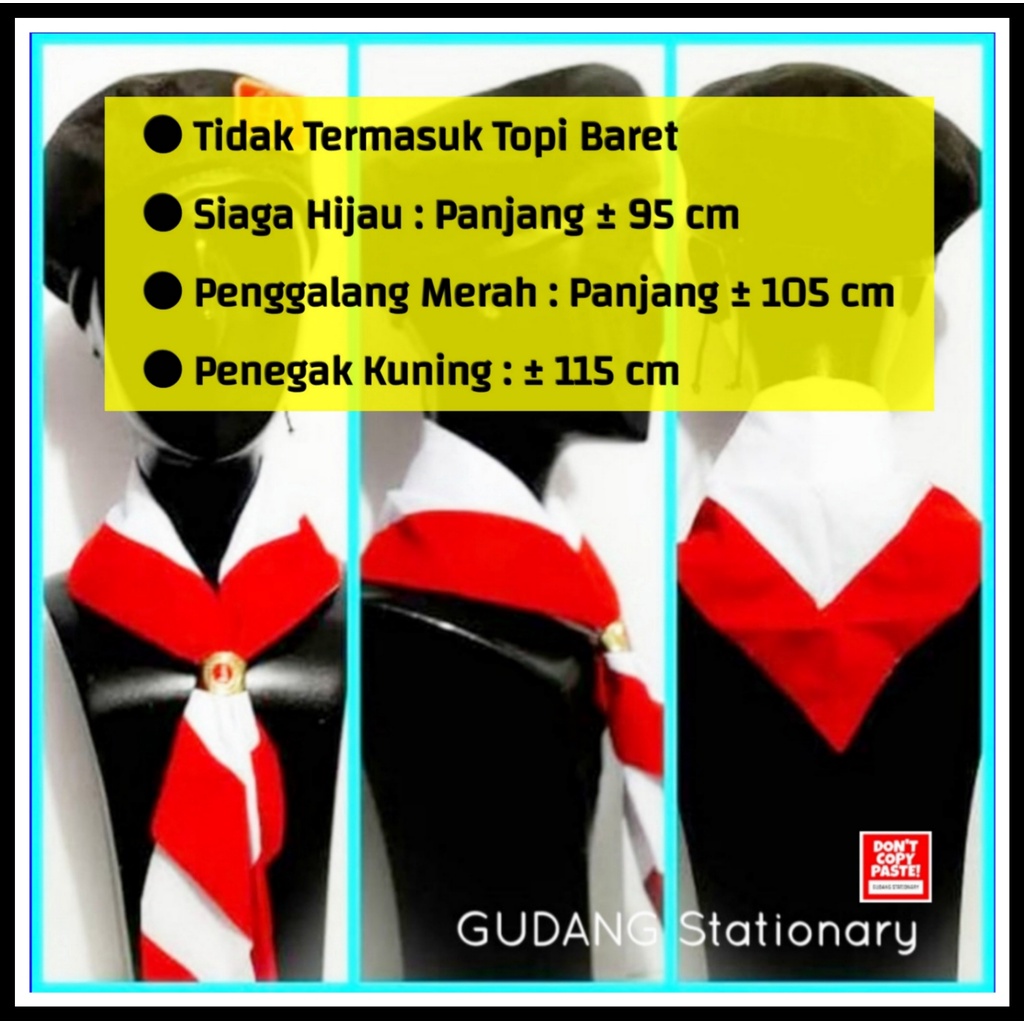 ● Halus, Lembut ● Tidak Mudah Kusut ● Include Ring Seng ● Ukuran panjang hasduk jika di bentang : ● -/+ 95cm = fit utk Siaga SD 1.2.3 ● -/+ 105 cm = fit utk Penggalang SD 4.5.6 dan SMP ● -/+ 115 cm = fit utk Penegak SMA dan setara