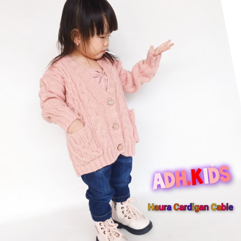 Haura Cardigan rajut anak dengan Variasi pola cable halus dan tebal . disertai saku kanan dan kiri .