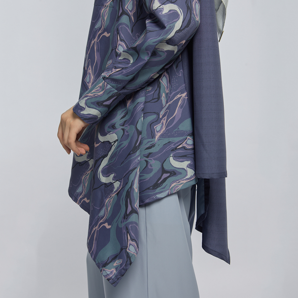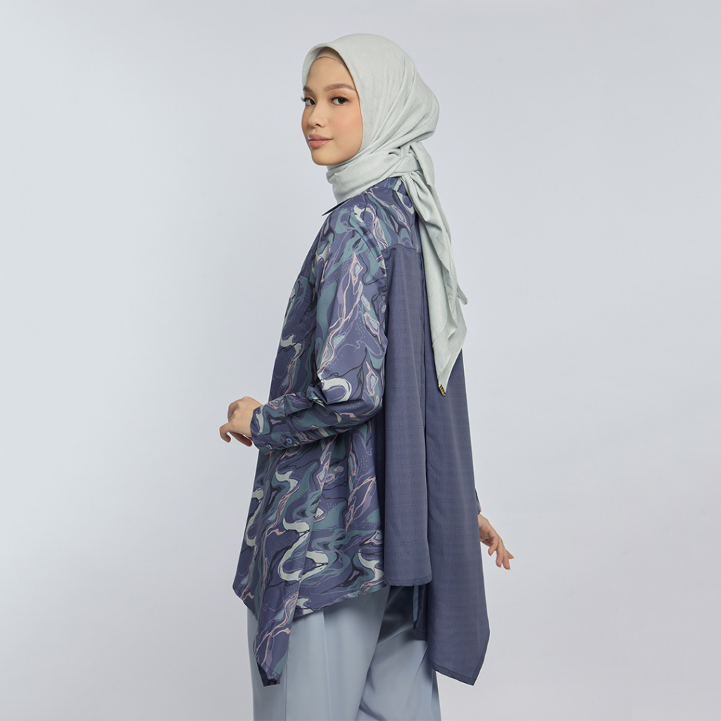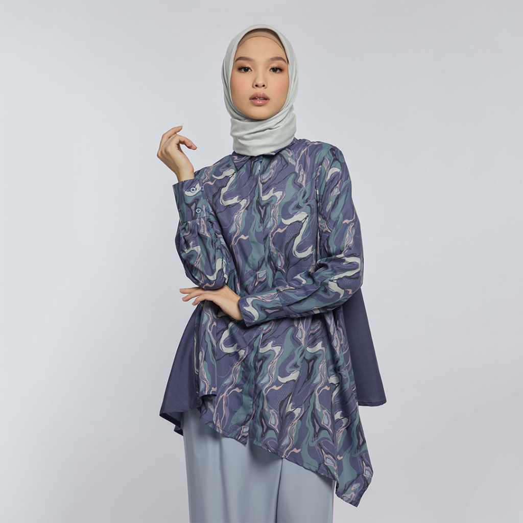 Atasan asimetris berbahan Katun poliyester. Menampilkan motif campuran, saku di bagian dada, yoke dengan lipit di bagian belakang, dan hem asimetris.