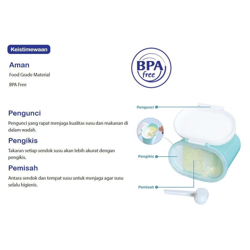 Merupakan wadah untuk menyimpan susu bubuk dengan kapasitas 800ml & 400 ml. Tutupnya, memiliki pengunci yang rapat untuk menjaga kualitas susu dan makanan di dalam wadah. Dilengkapi pengikis susu agar takaran setiap sendok susu lebih akurat. Antara sendok dan tempat susu, terdapat pemisah untuk menjaga agar susu selalu higienis. Dengan bahan BPA Free, aman untuk si kecil.