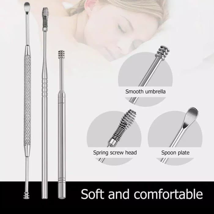 Deskripsi Set Pembersih Telinga Korek Kuping 5 PCS stainless steel besi 5 IN 1 Kegunaan : - Secara efektif membuang kotoran telinga - Berbentuk sendok dan spiral memberikan pijatan yang nyaman untuk telinga - Desain anti-slip sehingga tidak melukai telinga.