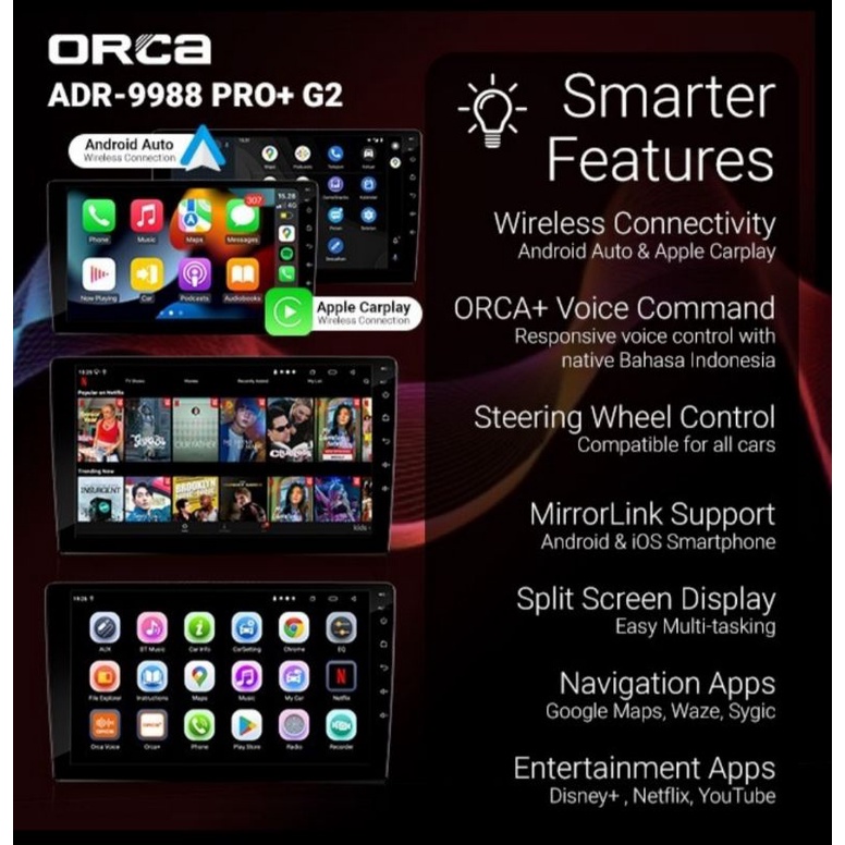 Dual HD Camera DVR TV ORCA ADR-9988 PRO+ Android Full Touch Screen (with Dual HD Camera DVR) Connectivity : Android Auto and Apple CarPlay (Wireless) 6 GB RAM + 128 GB ROM Layar: 9″ Gorilla Glass IPS Display Capacitive Touch Screen (1024 x 800 FULL HD Resolution) Operating System: Android OS 11 Speedy Performance: 1.5GHz Octa-Core Cortex A7 Processor (Start-up Boot in 1 second) Sound Quality: 32 Bands Customizeable DSP (with Golden Finger DJ Configuration) – Setting sesuai preferensi musik: Pop/Rock/Classic/Jazz/Custom, Radio Chip NXP-6856 (3o Bands Radio, FM/AM Lebih Jernih dan Kuat Sinyal), Bluetooth 4.0 + EDR (Enhance data rate membuat signal blueooth lebih kuat dan meningkatkan kualitas audio bluetooth), Built-in Power Amplifier (Hi-Fi Audio) Safety & Security: Integrated Dual Dash & Rear Camera CCTV/DVR HD 1080P (1024×600 resolution), Smart Cycle Recording (merekam saat starter mobil, file video baru menimpa file video yang paling terakhir), Parking Guard System (otomatis mulai merekam jika ada getaran saat mobil diparkir), External Memory USB Support. Smart Features: NEXAI+ Voice Command (2x lebih responsif dari voice command biasa), Split Screen Display, Mirrorlink Support (Android & iOS), Steering Wheel Control, Navigation Apps from Playstore (Google Maps, Waze, Sygic), Entertainment Apps (YouTube, Disney+, Netflix, Streaming Local TV Station, Vidio, HBO GO, dll.) Include: DUAL HD CAMERA DVR (FRONT + REAR CAMERA) Isi: 1 pcs Head Unit + Kabel Instalasi Plug&Play + Dual HD Camera DVR Max Output Power: 50Wx4, Speaker: 4-8 Ohms