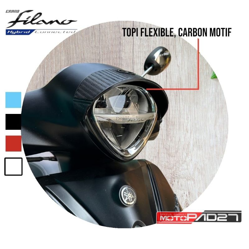 topi headlamp rubber khusus yamaha grand filano PNP, high quality, stong ADHESIVE, LENTUR, ketebalan kurang lebih 5 mili. terdiri dari 6 pilihan warna list merah list putih list tosca hitam carbon original produk motopad27. bukan produk kualitas murahan, bergaransi