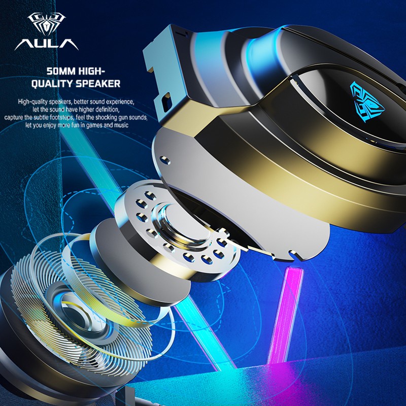 Headset Gaming AULA S501 diciptakan dengan model terbaru dengan Efek cahaya RGB pada bundaran kepala.