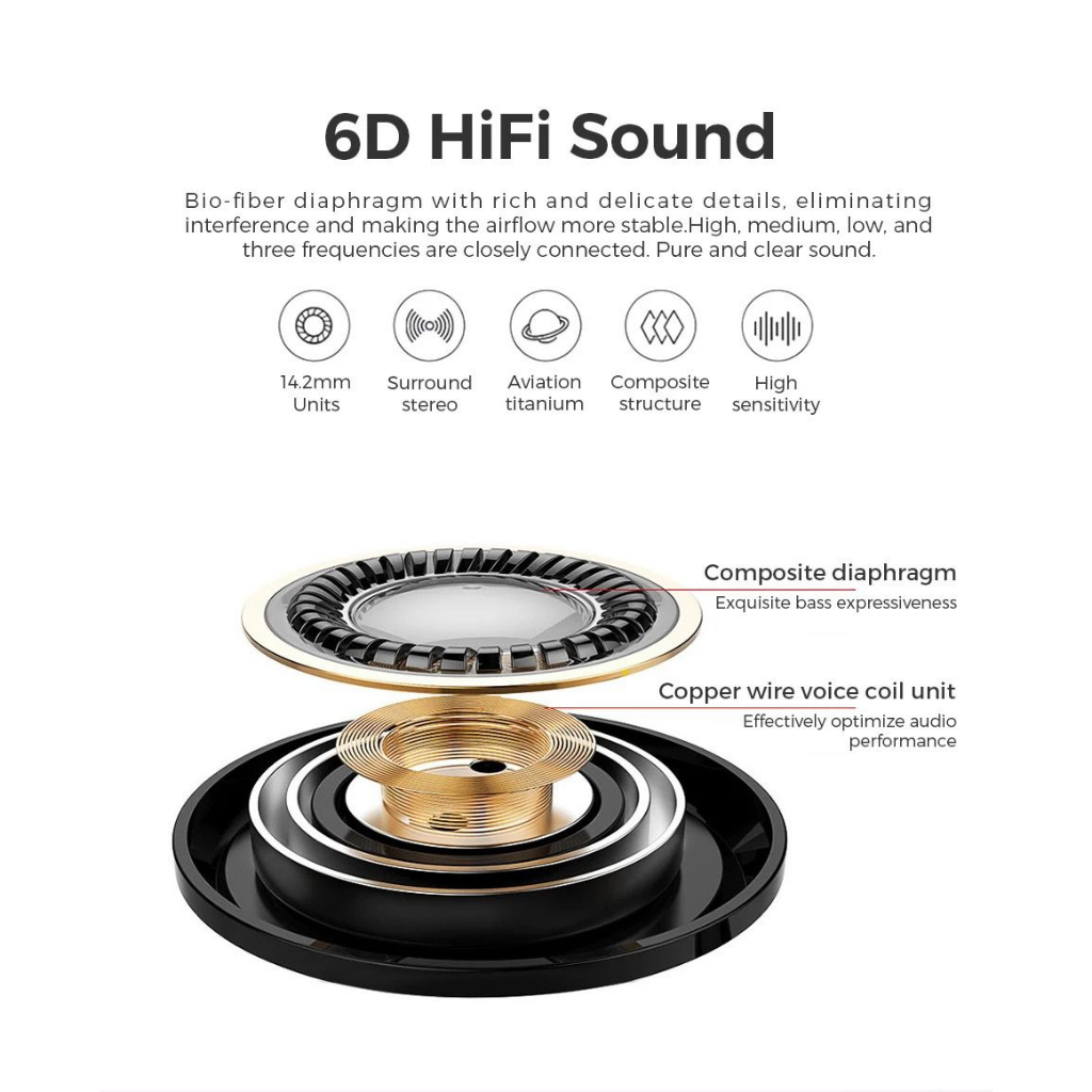 Desain metalik, memimpin tren mode 6D surround stereo sound, biarkan Anda berada di dunia musik Desain in-ear samping, nyaman dipakai, tidak mudah jatuh Diafragma bio-fiber dengan detail yang kaya, menghilangkan kebisingan dan membuat kualitas suara lebih jernih