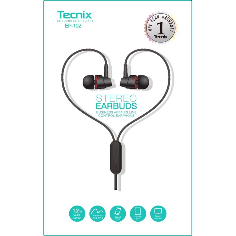 Brand : TECNIX Type : EP-102 Color : White & Black Frequency Response : 20Hz-20KHz Driver Impedance : 16±15% Driver Size : 10 mm Input Power : Rated~3mW Output S.P.L : 101dB±3dB Microphone Sensitivitys : ?-45dB±3dB Cord Length : 1.2m Plug : 3.5 mm