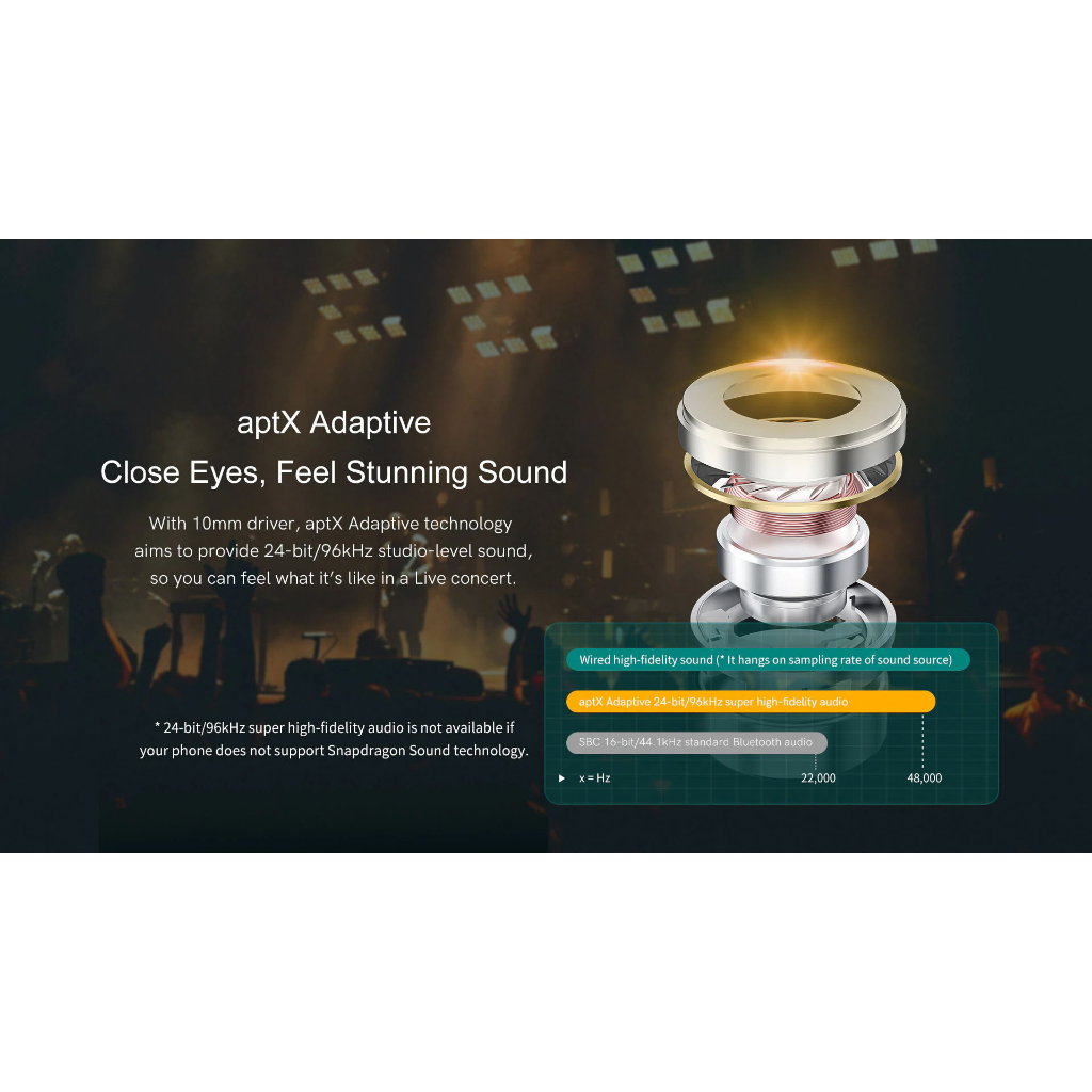 Menghasilkan Suara Obrolan yang Lebih Jernih Headset yang satu ini didukung dengan teknologi aptX, yang berfungsi untuk melakukan kompresi serta dekompresi musik saat diputar pada headset. Kompresi yang terjaga membuat frekuensi yang dihasilkan lebih stabil sehingga Anda dapat menikmati suara dengan lebih nyaman. Bahkan teknologi ini menawarkan panggilan suara pita super 32 KHz yang dapat menghasilkan suara lebih jelas dan jernih saat mengobrol lewat telfon.