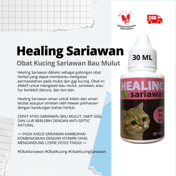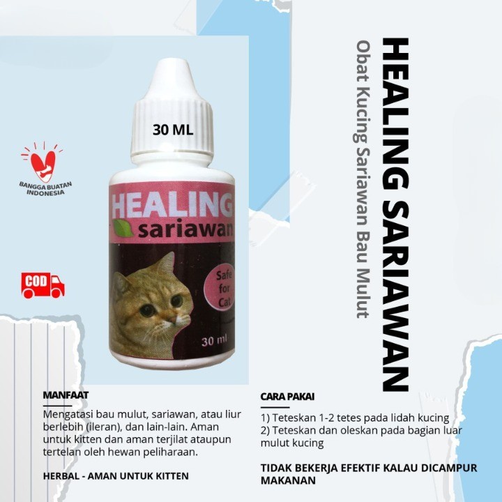 Healing Sariawan adalah obat untuk kucing yang bermanfaat untuk mengatasi permasalahan pada mulut seperti : Sariawan, bau mulut, air liur berlebih, dan masalah mulut lainnya.