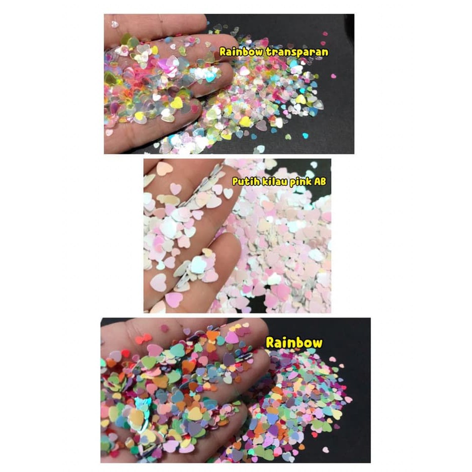 Glitter berbentuk hati/love warna putih, Kilau rainbow>> ukuran glitter campur