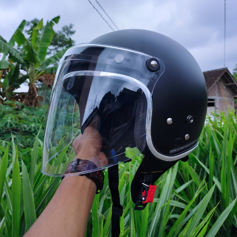 Detail HELM BOGO KACA VENOM RETRO LIST CHROME FULL LEHER TERBARU