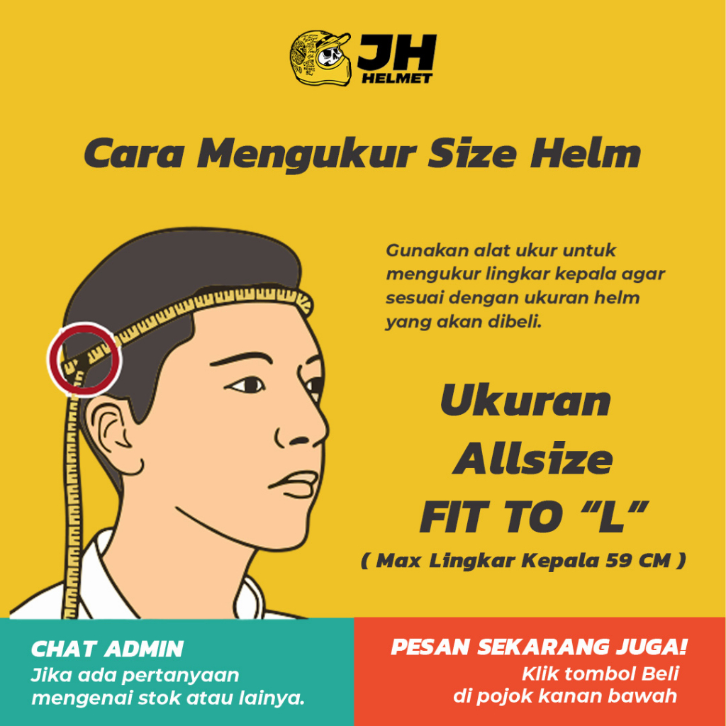Allsize Fit To L *PERHATIAN !! Helm Cakil memiliki ukuran lebih kecil dibanding helm biasa. Semua ukuran Helm Cakil HBC sama, tidak bisa request ukuran Cocok untuk Bro/Sist yang memiliki lingkar kepala diantara 52 sampai 59 cm