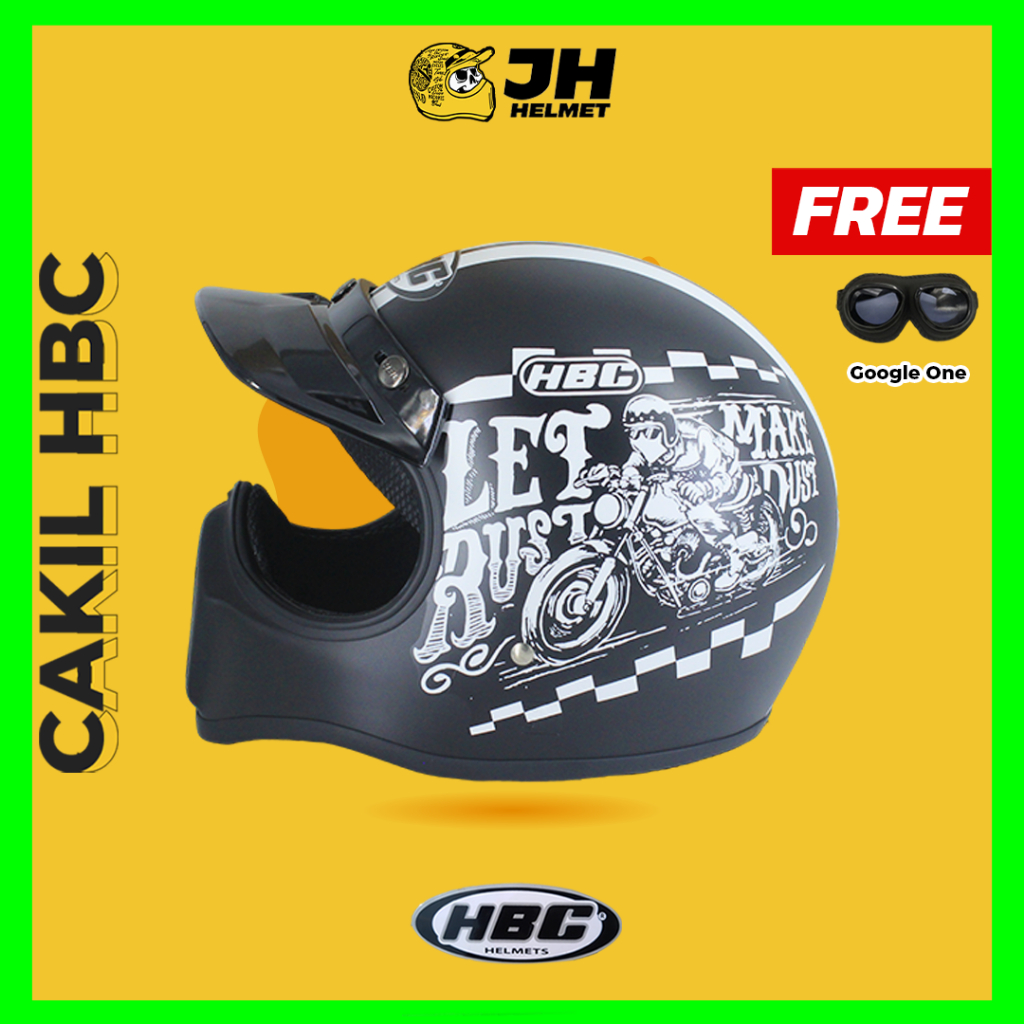Otomotif > Aksesoris Pengendara Motor > Helm & Aksesoris Pengendara Motor > Helm Cakil HBC Rust Dust Black Font White Doff + FREE GOGGLE | Retro Full Face | JUAL HELM