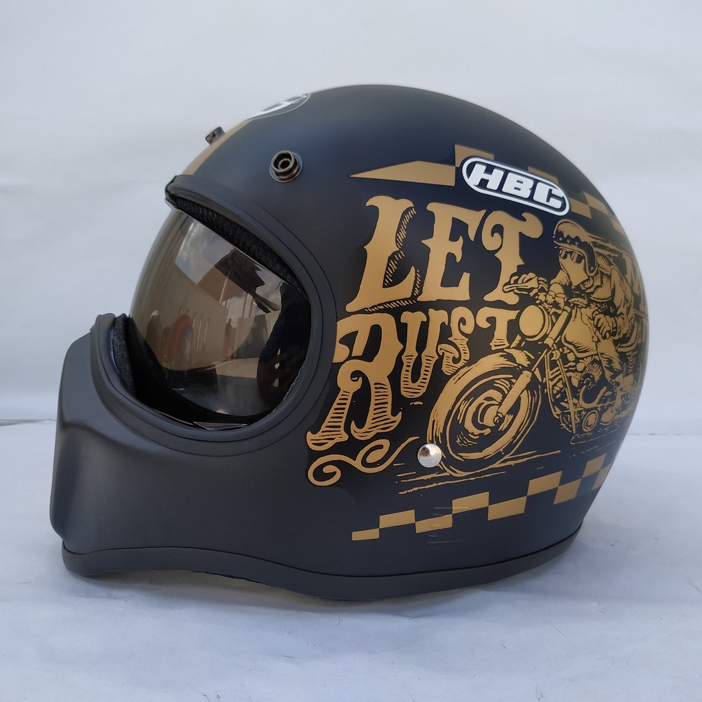 Detail Helm Cakil HBC Rust Dust Black Font Gold + Inner Visor ( Fullface / Retro / Klasik / Vespa )
