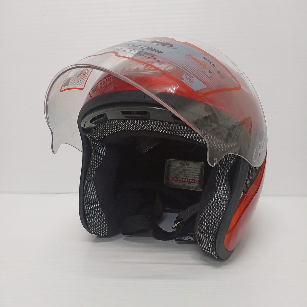 spesifikasi produk : Jenis Helm : Half Face kaca : single visor Tipe Kaca : Clear Jenis Kaca : Standart visor Pinlock : No Tear off : No Pengait Dagu : Microlock Size : ALL SIZZE packing : Sarung helm + kardus