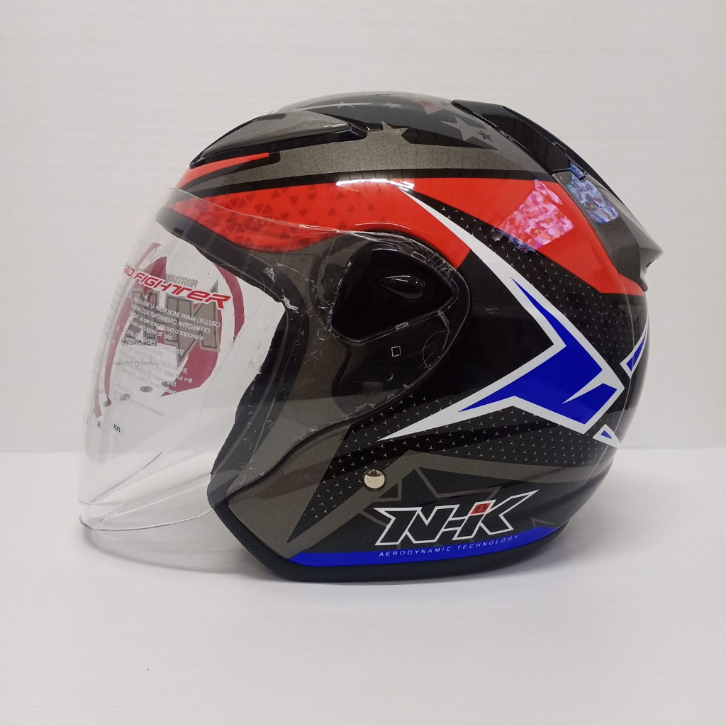 100% original spesifikasi produk : Jenis Helm : half Face kaca : single visor Tipe Kaca : clear Jenis Kaca : Standart visor Pinlock : No Tear off : No Busa : Full knock down Pengait Dagu : Microlock Size : M, L, XL packing : sarung helm & kardus